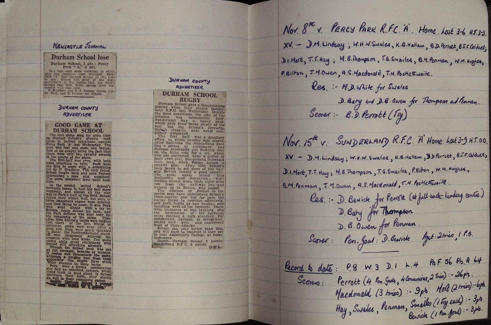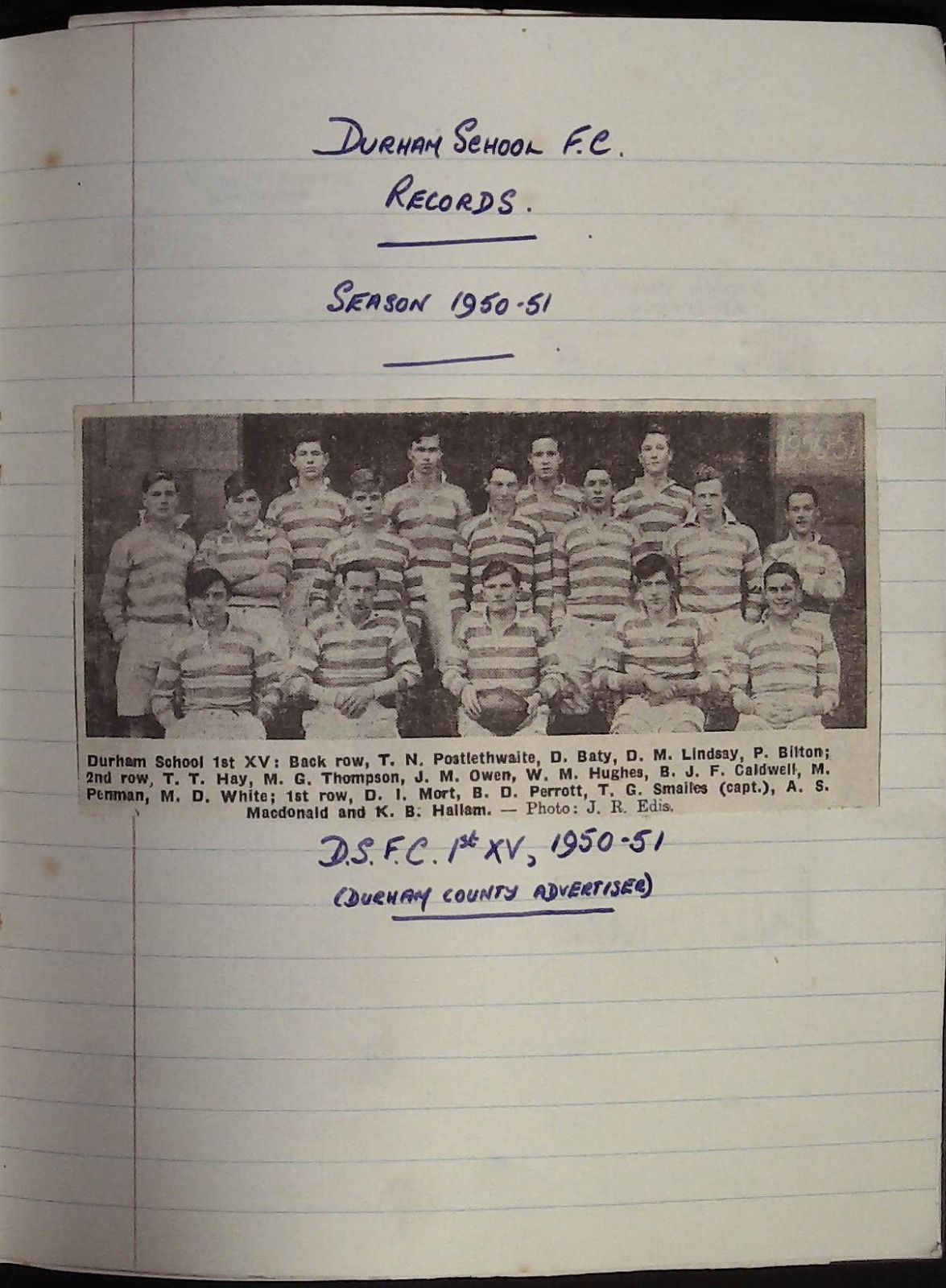 This October marks the celebrations of the 175th anniversary of the Durham School Football Club, with the school being rightfully proud that it is one of the four oldest English schools to play the game of rugby. In preparation for this, I have been looking through the archives at the school's rugby history, and have also been fortunate enough to have been sent various interesting materials relating to rugby. One such item was sent by OD Alastair MacDonald, who attended the School as a Caffinite from 1946 to 1951, playing in the 1st XV from 1949 to 1951. It consisted of an exercise book in which he had compiled a record of both the Northern RFC ("the club I had joined in Gosforth for School's rugby in the holidays and obviously followed obsessively") and the School's 1st XV for the 1950-1951 academic year. The fixture list is as follows: September 27th 1950 v. Northern F.C. Home. Lost 0-18. H.T. 0-5 Oct 4th 1950 v. Dame Allan's School. Home. Drawn 8-8. H.T. 0-3 Oct 11th v. St. Peter's School, York. Away. Won 14-9. H.T. 6.0. Oct 14th v. Leeds Grammar School. Home. Won 17.5. H.T. 9.5 Oct 21st v. St. bees School. Away. Lost 0-3. H.T. 0.3 Nov. 4th v. R.G.S, Newcastle. Away. Won 11-6. H.T. 3.3 Nov. 8th v. Percy Park R.F.C. 'A'. Home. Lost 3-6. H.T. 3.3 Nov. 15th v. Sunderland R.F.C. 'A' Home. Lost 3.9. H.T. 0.0 Nov. 18th v, Ampleforth College. Home. Lost 11.21. H.T. 6.13 Nov. 25th v. Giggleswick School. Home. Won 17-6. H.T. 11.3 Nov. 29th v. Barnard Castle School. Away. Drawn 3.3. H.T. 3.0 Jan 24th 1951 v. King's College R.F.C. II. Away. Lost 0.8. H.T. 0.8 Jan 31st v. Durham Colleges R.F.C. 'A'. Away. Cancelled (frost) Feb 7th v, The Medical R.U.F.C. II. Home. Lost 0.3. H.T. 0-0 Each game is accompanied by the relevant cutting from Durham County Advertiser. Proudly, a Durham School victory over the old rivals of St. Peter's York is noted, winning by "one goal, two penalty goals and one try (14 points) to three tries (9 points). The game marked the first success against St. Peter's since 1947. To quote the Durham County Advertiser: "For the first time this season Durham School's back line was at full strength when they played St. Peter's School at York last Wednesday. It was soon obvious that the attack was going to be more effective than previously. St. Peter's had a fairly well balanced side but were seldom able to heel the ball either loose or set scrums." The Durham County Advertiser was complementary towards the game against Percy Park on the 8th November 1950. "The best game seen for some time on Durham School's ground took place in perfect conditions against Percy Park 'A' last Wednesday. The play was fast and open, one indication of its quality being the fact that were only two penalty awards in the course of the game. The first-half was even, with both sides attacking in turn. Park were the first to score with a scrambling try by O. Bradbeer. The kick failed. School fought back and soon Perrott intercepted a pass and equalised. The score remained level until half-time… Though the School pack was not at full strength because of injuries, it heeled well throughout the game, although a quicker heel from their opponents' line might have given better chances to their backs." Judging by the 'D.W.L.' signature at the bottom of each of the newspaper columns, these were written by Donald William Limon, a School Monitor who attended the school from 1946 to 1950. Limon left in December 1950, and sure enough the two articles from 1951 lack his trademark style. "Limon's reports didn't spare us any criticism!" observed Mr MacDonald on the subject. The news clippings are not the only items found in the exercise book. The enclosed clothes list ("Please fill in number sent and return next term. All clothes must be plainly marked") demonstrate an individual preoccupied with rugby. 'Greatcoat or Mackintosh', 'House Shoes' and 'Cricket Boots' have been crossed out, while Macdonald requests 2 pairs of football boots, 6 grey socks, white football jersey, a striped football jersey, football stockings and football shorts. On the reverse, Macdonald lists more equipment: 4 towels, a scrum cap, 2 linen bags, 1 pair of 'north' socks. One photograph demonstrates a scrum in the School vs. St Bees Match of 1949, with St. Bees winning 6 points to 3. The book is a testament to the DSFC's long 175-year history. Happily, I am saved from An article in the 16th November 1961, helpfully enclosed in Mr MacDonald's exercise book, provides an overview of the history of the DSFC as part of a series on school rugby: "Durham play St. Peter's, Leeds Grammar School, St. Bees, Dame Allan's Newcastle, Newcastle R.G.S., Ampleforth, Giggleswick, and Barnard Castle. Rugger s believed to have started at Durham in 1851 and the names of captains of football are preserved from 1854. The St. Peter's match is the oldest and was first played in 1882. Of the 32 matches played against Ampleforth, 13 have been won and 18 lost with one draw. The list of internationals goes back to 1886, with 18 English and two Scottish. The list of blues from 1883 is six Oxford and 13 Cambridge. There were not many more than 100 boys at Durham up to the first world war and the full strength is now 225. Durham claims probably to have the longest unbroken sequence of representatives on one side in a university match, Cambridge 1925-32, and also to share with Fettes the record of having four players in a single university match on two occasions." It is this legacy that we will be celebrating on the 18th October. I would encourage any readers who have similar items of note to send them to the school archives. ![]() ![]() ![]() ![]() |